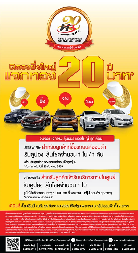 พระราม 3 กรุ๊ป ฮอนด้า (H3) ฉลองยิ่งใหญ่สุดอลังการครบรอบ 20 ปี แจกทองคำ 20 บาท* ไม่ว่าจะซื้อ ซ่อม หรือจอง ทุกรุ่น มีสิทธิ์ลุ้นรางวัลใหญ่ทุกเดือน สำหรับลูกค้าที่ซื้อรถยนต์ฮอนด้า และลูกค้าที่เข้ารับบริการกับ พระราม 3 กร๊ป ฮอนด้า ทั้ง 7 สาขา ตั้งแต่วันนี้ถึง 25 ธันวาคม 2559 พระราม 3 กรุ๊ป ฮอนด้า "เราให้คุณเหนือกว่า"