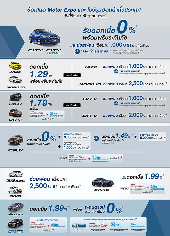 ฮอนด้า มาแรงโค้งสุดท้ายกับโปรโมชั่นเด็ดๆ ส่งท้ายปี 2559 ด้วยข้อเสนอสุดพิเศษที่ไม่อาจปฏิเสธได้ ทุกรุ่นทุกแบบ พร้อมเงื่อนไขเดียวกันกับในงาน Motor Expo 2016