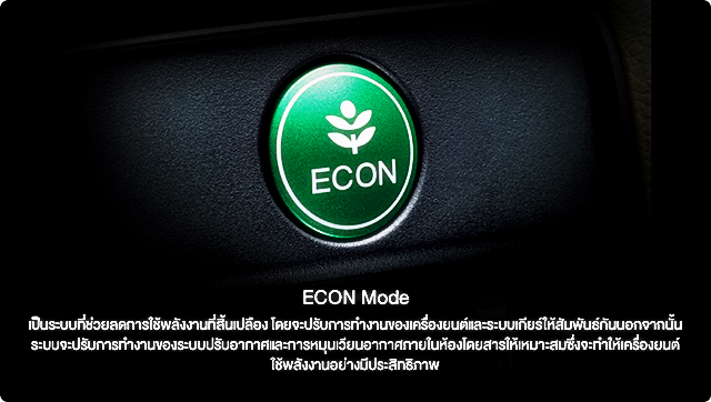 รถยนต์ฮอนด้า สามารถเลือกรูปแบบการขับขี่ได้ 3 แบบ (เฉพาะบ้างรุ่น) คือ ขับขี่ปกติ, ขับแบบสปอร์ต และเน้นความประหยัด โดยเฉพาะระบบ ECON ที่ฮอนด้าภูมิใจนำเสนอนั้นตอบสนองความประหยัดและให้ความสะดวกสบายแก่ผู้ขับขี่ โดยไม่ต้องกังวลในการคอยระวังการขับเร็วไปหรือช้าเกินไป ระบบ ECON จะช่วยการขับขี่ในรูปแบบประหยัด ด้วยการประมวลผลการฉีดน้ำมันเชื้อเพลิง ตำแหน่งเกียร์และอัตราทด เพื่อรักษาอัตราการสิ้นเปลืองที่คงที่มากที่สุด แต่หากจำเป็นต้องใช้กำลังในการเร่งแซงอย่างรวดเร็ว ระบบก็จะคำนวณการจ่ายน้ำมันเพิ่มตามการสั่งงานของคันเร่งที่เท้าผู้ขับ และพร้อมที่จะพุ่งทะยานไปข้างหน้าอย่างทันใจ หลังจากนั้นก็จะกลับเข้าสู่รูปแบบประหยัดเช่นเดิม นับว่าเทคโนโลยี ECON ทั้งประหยัดและปลอดภัยในระบบเดียว