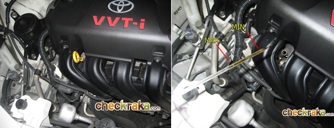 การเช็คระดับน้ำมันเครื่องควรทำบนพื้นราบ และเครื่องยนต์ไม่ร้อนเกินไป โดยให้ดึงก้านวัดตามรูป แล้วเช็ดด้วยผ้าสะอาดก่อนเสียบกลับ ทิ้งไว้ราว 3 นาที จึงดึงก้านออกเพื่อดูระดับน้ำมันว่าขีดอยู่ระหว่าง MAX-MIN หรือไม่ พร้อมทดสอบความหนืดของตัวน้ำมันเครื่องฯ ด้วยว่ายังข้นเพียงพอ (อาจต้องใช้สองนิ้วสัมผัสดูว่ายึดติดนิ้วแค่ไหน)