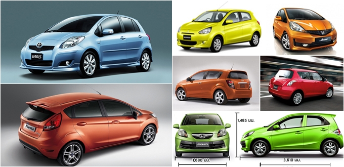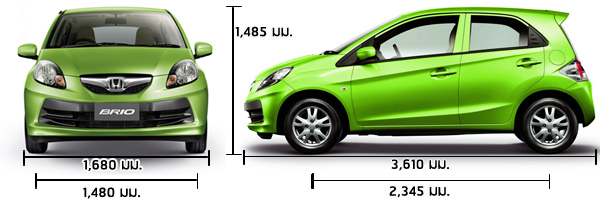 | Honda Brio | เบนซิน 4 สูบ 1,198 ซีซี SOHC 16 วาล์ว i-VTEC 90 แรงม้า แรงบิด 110 นิวตัน-เมตร รองรับ E20 ระบบเกียร์ CVT/ 5 MT ขับเคลื่อนล้อหน้า | หน้า-แม็คเฟอร์สันสตรัท,เหล็กกันโคลง หลัง-ทอร์ชั่นบีมรูปตัวเอช พวงมาลัยไฟฟ้า เบรกหน้าดิสก์/หลังดรัม | ยาว 3,610 มม. กว้าง 1,680 มม. สูง 1,485 มม. ฐานล้อ 2,345 มม. รัศมีวงเลี้ยว 4.5 ม. | อัตราสิ้นเปลืองเฉลี่ยในเมือง 14-16 กม./ลิตร ความเร็วสูงสุด 145 กม./ชม.(ล็อคความเร็ว) | ขนาดเล็กประหยัด, แรงม้ามากและช่วงล่างดีสุดในพิกัด 1.2 ลิตร, ป้องกันความเร็วไว้ที่ 145 กม./ชม. |
