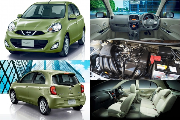 | Nissan March | เบนซิน 3 สูบ 1,198 ซีซี DOHC12 วาล์ว CVTC 79 แรงม้า แรงบิด 106 นิวตัน-เมตร รองรับ E20 ระบบเกียร์ CVT/5 MT ขับเคลื่อนล้อหน้า | หน้า-แม็คเฟอร์สันสตรัท,เหล็กกันโคลง หลัง-ทอร์ชั่นบีม พวงมาลัยไฟฟ้า เบรกหน้าดิสก์/หลังดรัม | ยาว 3,800 มม. กว้าง 1,665 มม. สูง 1,515 มม. ฐานล้อ 2,450 มม. รัศมีวงเลี้ยว 4.5 ม. | อัตราสิ้นเปลืองเฉลี่ยในเมือง 13-16 กม./ลิตร ความเร็วสูงสุด 165 กม./ชม. | ภายในกว้างนั่งสบาย, ประหยัด, ช่วงล่างดี, เสียงรบกวนน้อยเมื่อความเร็วสูงๆ, สิ่งอำนวยความสะดวกครบ |
