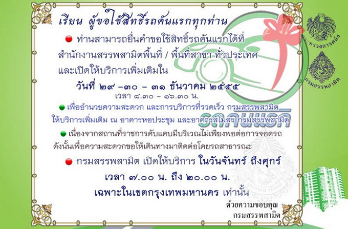 - สำนักงานสรรพสามิตพื้นที่ หรือสำนักงานสรรพสามิตพื้นที่สาขา ตามทะเบียนบ้านหรือสถานที่จดทะเบียนรถยนต์ โดยต้องยื่นพร้อมเอกสารที่ต้องใช้ (ในด้านบน) ก่อนวันที่ 31 ธันวาคม 2555