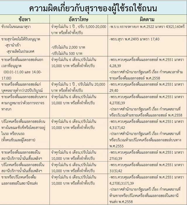 นอกจากขับรถโดยใช้ความตามกำหนดแล้ว การดื่มสุราขณะขับรถหรือการจำหน่ายก็ผิดกฏหมายและอันตราย มาดูว่าอัตราโทษของการจำหน่ายและดื่มสุราที่เกี่ยวข้องกับการขับขี่กันครับ