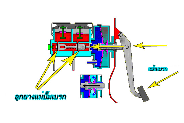 ระบบไหลเวียนน้ำมันเบรกเป็นระบบปิด มีลักษณะถ่ายเทกำลังไป-กลับ เมื่อจานเบรกคด จะผลักดันผ้าและลูกสูบเบรกให้ถอยกลับ น้ำมันเบรกจึงถูกดันไหลกลับไปสู่กระบอกแม่ปั๊มเบรกตัวบน และดันชุดลูกสูบเบรกตัวบนส่งกลับมายังแป้นเบรกจึงเกิดอาการเบรกสู้เท้านั่นเองครับ