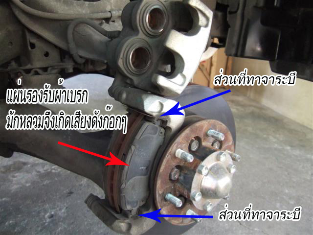 ควรทำความสะอาด และทาจาระบีที่แผ่นล็อกผ้าเบรก ระวัง! อย่าให้จาระบีถูกจานและผิวสัมผัสผ้าเบรก