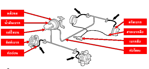 จุดข้อต่อต่างๆ ของท่อทางเดินน้ำมันเบรกไหลไปสู่คาลิปเปอร์เบรกที่ล้อทั้ง 4