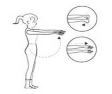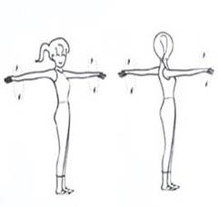 ท่าที่ 5 ยืนในท่าที่ต่อจากท่าที่ 4 กางแขนทั้งสองออกข้างลำตัวหมุนแขนไปข้างหน้าพร้อมๆกันทั้งสองข้าง 50 ครั้งแล้วหมุนไปข้างหลังอีก 50 ครั้ง