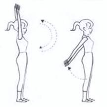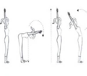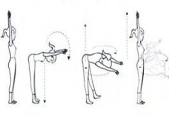 ท่าที่ 10 ยืนตัวตรง ยกแขนทั้งสองข้างขึ้นตั้งตรง โน้มตัวไปข้างหน้าให้ลำตัวขนานพื้นค้างไว้ 5 วินาที แล้วกลับสู่ท่าเดิม เอนตัวไปด้านหลังพอประมาณ แล้วกลับสู่ท่าเดิม ทำสลับกันไป - มา