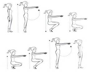 ท่าที่ 13 ยืนตัวตรง เขย่งปลายเท้า เหยียดแขนตรงไปข้างหน้าขนานกับพื้น ย่อตัวลง ค่อยๆ ยืนขึ้นในท่าเดิม เอาส้นเท้าลงแล้วกลับสู่ท่าเดิม