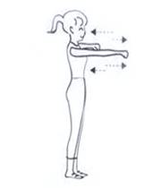ท่าที่ 1 ยืนตัวตรง เหยียดแขนทั้งสองข้างไปข้างหน้าขนานกับพื้น กำมือแน่นสลับกัน