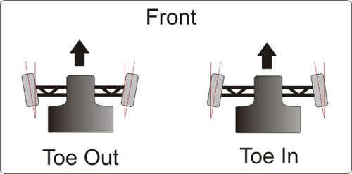 มุมโท-อิน โท-เอาท์ ตั้งที่ส่วนปลายแร็คหรือลูกหมากคันชักคันส่ง เพื่อปรับให้ล้อนั้นกางออกหรือหุบเข้า