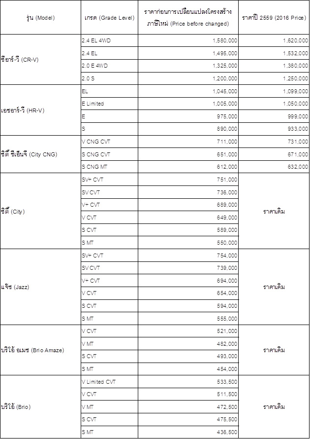 ตัวอย่างราคารถยนต์ฮอนด้าที่เปลี่ยนแปลงหลังปรับฐานภาษีในปี 2016
