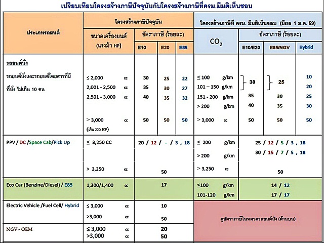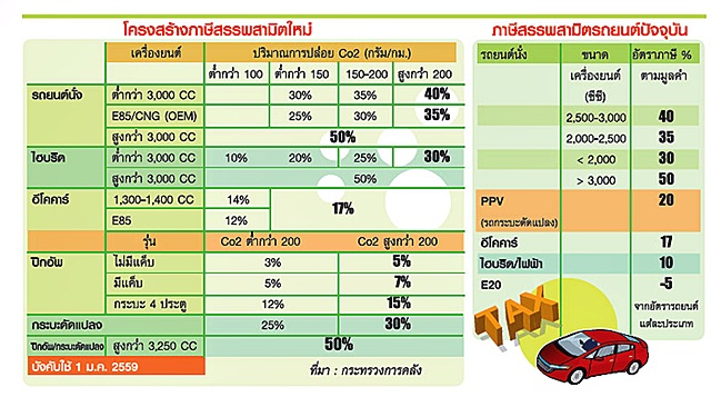 สรุปให้เข้าใจอย่างง่ายๆ ก็คือการจัดเก็บภาษีรถใหม่หลักๆ คือ วัดจากการปล่อยไอเสียหรือก๊าซคาร์บอนไดออกไซด์ (CO2) ไม่ว่าจะรถแบบไหน ขนาดเครื่องยนต์เท่าไหร่ก็ตาม ย่อมมีผลให้ราคาเปลี่ยนแปลงทั้งขยับขึ้นหรืออาจขยับลงก็ได้ ดังนั้นราคารถใหม่ในปี 2559 นี้ไม่จำเป็นต้องเพิ่มขึ้นเสมอไป อาจมีบางรุ่นต่ำกว่าเดิมก็เป็นได้ เช่น กลุ่มปิคอัพและพีพีวีเครื่องยนต์ดีเซล มีการปล่อย CO2 มากหน่อยก็อาจเพิ่มขึ้น ส่วนกลุ่มอีโคคาร์และไฮบริดบางรุ่นอาจถูกลง