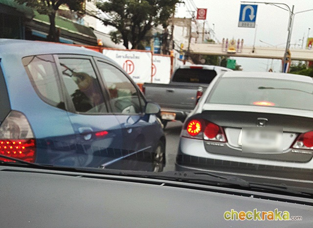 (3)(1) ถ้าสัญญาณจราจรไฟสีเขียวปรากฏข้างหน้า แต่ในทางร่วมทางแยกมีรถอื่นหยุดขวางอยู่จนไม่สามารถ ผ่านพ้นทางร่วมทางแยกไปได้ ผู้ขับขี่จะต้องหยุดรถที่หลังเส้นให้รถหยุดจนกว่าจะสามารถเคลื่อนรถผ่านพ้นทางร่วมทางแยกไปได้