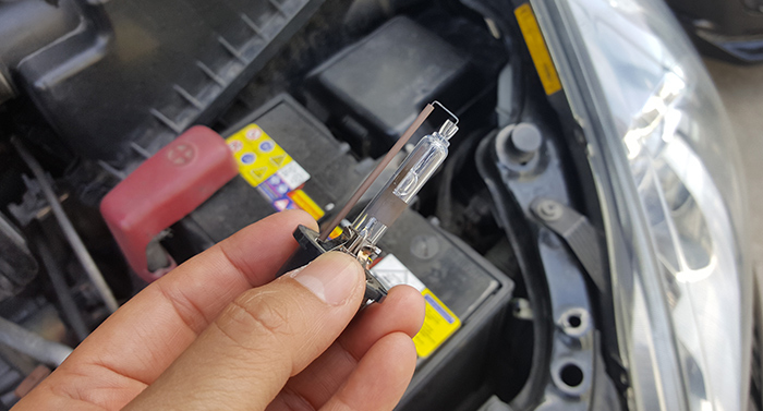 5. นำหลอดอันใหม่มาใส่แทนที่ โดยระวังห้ามจับบริเวณหลอดแก้วเด็ดขาด เพราะจะทำให้อายุการใช้งานสั้นลงได้ ให้จับที่ขั้วเท่านั้น และใส่กลับเข้าไปในช่องหลอดไฟ โดยให้เขี้ยวที่ขั้วหลอดตรงกับฐานของโคมไฟเพื่อให้หลอดเข้าที่แนบสนิทพอดี ระวังไม่ให้ปีนร่องหรือเผยอ หลังจากนั้นก็ย้อนขั้นตอนการถอดเป็นอันเสร็จสิ้น