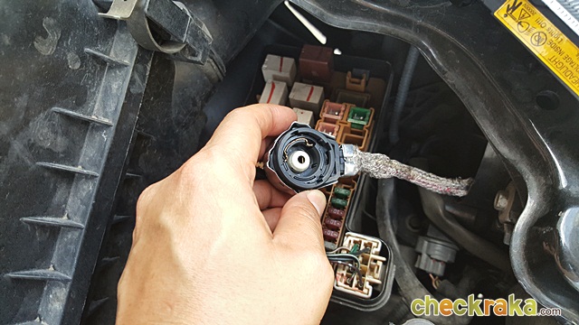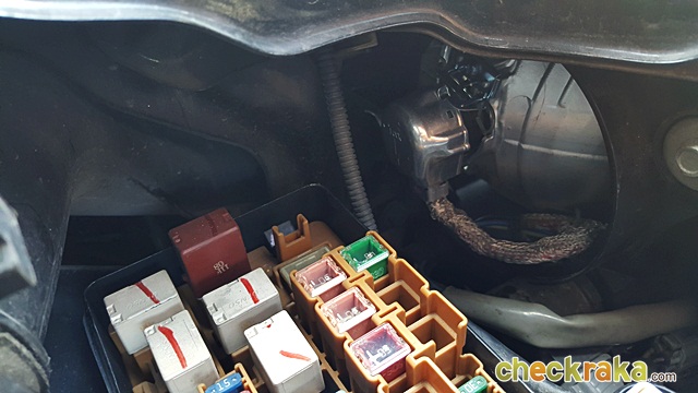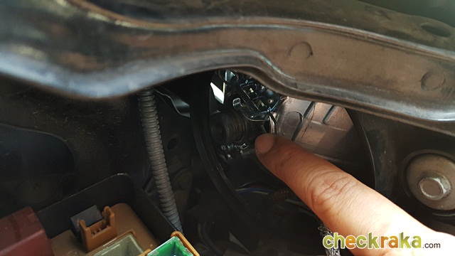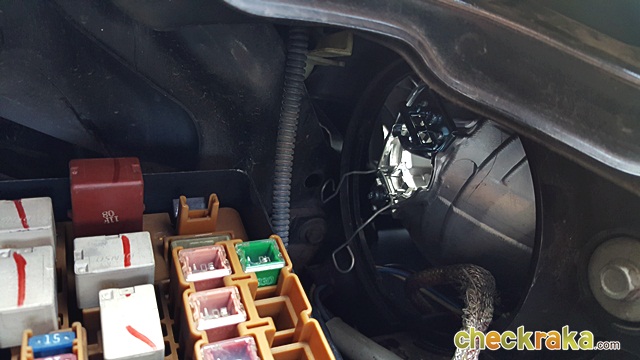 1. จัดการสิ่งกีดขวางที่อยู่บริเวณด้านหลังโคมไฟที่จะเปลี่ยน เพื่อความสะดวกในการถอดฝาครอบกันฝุ่นออกมาครับ ซึ่งฝาครอบกันฝุ่นของรถยนต์แต่รุ่นอาจไม่เหมือนกันบางรุ่นเป็นพลาสติก บางรุ่นเป็นยางหุ้มครับ ส่วนในตัวอย่างนี้เป็นพลาสติก และสิ่งกีดขวางก็คือ ฝากล่องฟิวส์นั่นเอง