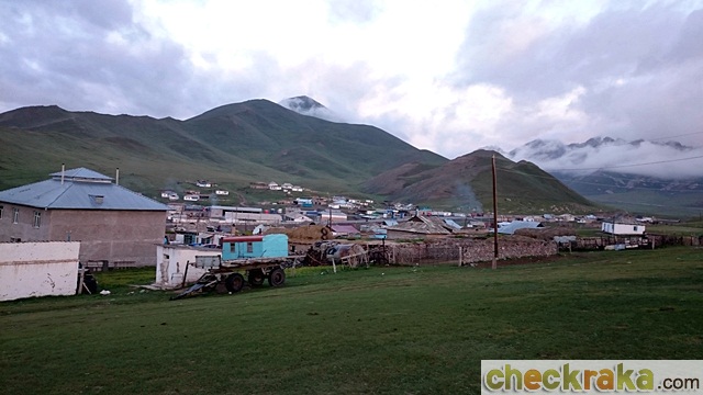 เมื่อถึงหน้าด่านประตูข้ามแดนจีน ช่วงนั้นเป็นถนนแคบๆ มองข้างหน้ามีประตูบานทึบกั้น ข้างทางเป็นร้านค้ารกร้าง เราได้รับการแจ้งจากไกด์ว่าประตูเปิดเป็นรอบเวลา ทำให้ต้องรอคอยพร้อมกับคนอื่นๆ เมื่อประตูเปิดก็มีเทหารเข้ามาตรวจ แต่ยังต้องไปขับเจอด่านตม.ของคีร์กีซสถานข้างหน้าอีก เมื่อถึงด่านทุกคนต้องลงจากรถไปแสดงตัวและผ่านการตรวจพาสปอร์ต แม้จะเข้มงวด แต่ก็ใช้เวลาไม่นานนัก เว้นแต่รถที่ต้องผ่านการตรวจอย่างละเอียด ช่วงนี้ฝนเริ่มเทลงมาอย่างหนัก กว่าทุกอย่างจะผ่านครบขั้นตอนก็ใช้เวลาไป 2 ชั่วโมงกว่า การเดินทางก็เริ่มต้นอีกครั้งสู่เมืองเล็กๆ ที่เรียกว่า ซารี-แทช ความสวยงามเริ่มปรากฎให้เห็นตามเส้นทางที่วิ่งไต่เขาขึ้นมา และเมื่อขับถึงข้างบน พวกเราก็จอดเพื่อถ่ายรูปบรรยากาศเขาหิมะไกลๆ อุณหภูมิบนหน้าปัดรีโว่แสดงเลข 7 องศาฯ แต่ก็ไม่เป็นอุปสรรคต่อการออกไปชมธรรมชาติอันสวยงามแห่งนี้ เรารู้ว่าคืนนี้ต้องนอนโฮมสเตย์ในซารี-แทช อากาศที่เย็นแบบนี้ทำให้เราหลายคนปรับตัวไม่ค่อยทัน เพราะไม่กี่วันที่ผ่านมาเพิ่งเจออุณหภูมิร้อนจัดขนาด 50 องศาฯ แต่ค่ำคืนในซารี-แทช พวกเราต้องนอนขดกันในโฮมสเตย์แน่ๆ