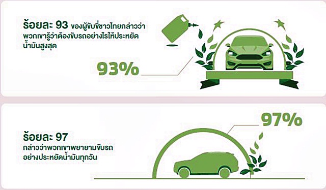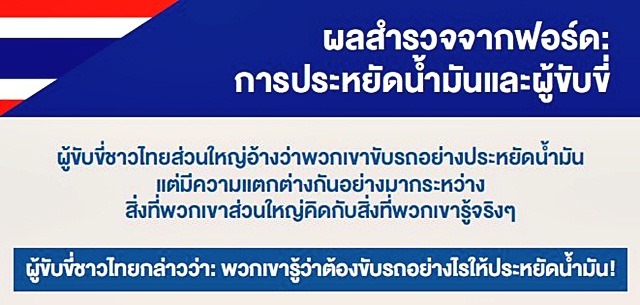 จากผลสำรวจล่าสุดด้านการประหยัดน้ำมันของฟอร์ด มอเตอร์ คัมปะนี ผู้ขับขี่ชาวไทยจำนวน 1,026 คนได้ร่วมตอบแบบสอบถามเกี่ยวกับนิสัยการขับขี่และความรู้เกี่ยวกับการประหยัดน้ำมัน ร้อยละ 93 ของผู้ขับขี่ชาวไทยกล่าวว่าพวกเขารู้ว่าต้องขับรถอย่างไรให้ประหยัดน้ำมันสูงสุด และร้อยละ 97 กล่าวว่าพวกเขาพยายามขับรถอย่างประหยัดน้ำมันทุกวัน