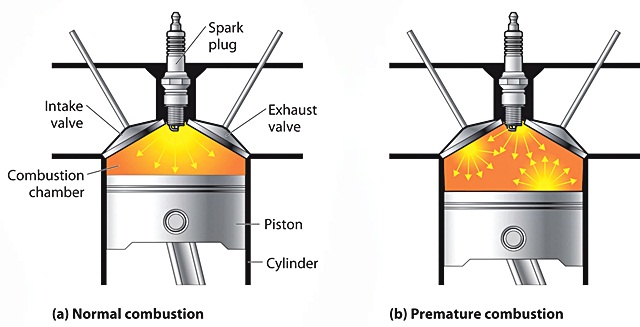 ในจังหวะจุดระเบิด ต้องใช้แรงดันจากการระเบิดผลักหัวลูกสูบให้เคลื่อนที่ลงด้านล่าง แต่การชิงจุดระเบิดนั้นเป็นจังหวะที่ลูกสูบกำลังเลื่อนขึ้นเพื่ออัดอากาศและเชื้อเพลิงให้แรงดัน กลับถูกประกายไฟจากเชื้อเพลิงจุดติดเองโดยไม่ถูกต้อง พยายามดันลูกสูบลงซึ่งสวนทางการเคลื่อนที่ของลูกสูบปกติ คิดดูว่าลูกสูบกำลังขึ้นอย่างรวดเร็วกลับถูกแรงระเบิดอัดด้านบนในขณะที่ลูกสูบยังต้องเลื่อนขึ้นจนถึงศูนย์ตายบนเพื่อให้หัวเทียนจุดเบิดในจังหวะปกติ จะเห็นว่าแรงอัดที่ปะทะนั้นก่อให้เกิดการสึกหรอขั้นรุงแรง จะเห็นว่าการเติมน้ำมันออกเทนต่ำกว่ากำหนดไว้เกิดผลเสียอย่างชัดเจน