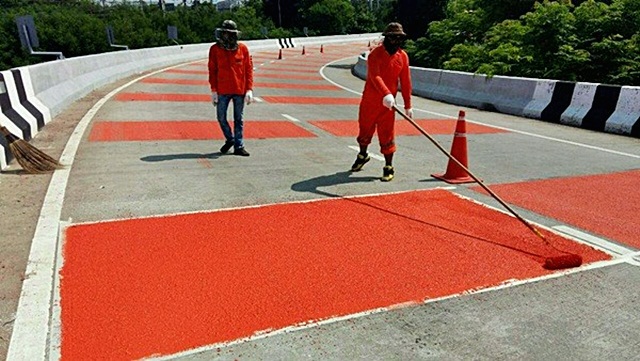 การทาสีแดงบนพื้นเพื่อกันรถลื่นตามโค้งอันตรายต่างๆ ช่วยเพิ่มความฝืดและป้องกันอุบัติเหตุได้มากกว่าพื้นผิวถนนปกติได้มากถึง 20% ซึ่งวิธีการนี้เป็นเพียงวิธีหนึ่งที่จะช่วยลดการเกิดอุบัติเหตุ แต่ผู้ขับขี่ก็ควรขับรถในความเร็วที่เหมาะสม และไม่ประมาทด้วยนะครับ