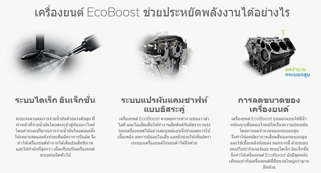 EcoBoost เป็นเครื่องยนต์ที่ชนะรางวัลยอดเยี่ยมระดับโลก ด้วยเทคโนโลยีล้ำสมัยที่สุดเท่าที่ฟอร์ดเคยสร้างมา สามารถลดอัตราการใช้เชื้อเพลิงได้สูงสุดถึง 20% แต่กลับให้สมรรถนะของเครื่องยนต์ที่ดีเยี่ยมทั้งในด้านความประหยัด และความแรงในเวลาเดียวกัน