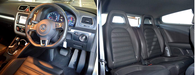 ที่นั่งคนขับ/ผู้โดยสารประตูบานใหญ่ของ Scirocco คันนี้เมื่อลองเปิดดู ก็ค่อนข้างประทับใจ เพราะเปิดกว้างได้ถึง 90 องศา ที่เวลาเปิด-ปิด จะมีแรงเหวี่ยงหนักๆสไตล์ประตูรถยุโรปที่ยาวและกว้าง พอเข้ามานั่งในห้องโดยสารที่ตกแต่งด้วยโทนสีดำ ตัวเบาะค่อนข้างต่ำ กะทัดรัด เวลานั่งจึงรู้สึกห้องโดยสารดูโปร่ง นั่งสบายสำหรับรูปร่างคนไทยที่ไม่ใหญ่มาก เพราะหากคนรูปร่างใหญ่อาจจะนั่งแล้วอึดอัดซักนิด ส่วนพื้นที่วางขาผู้โดยสารหน้านั้นกว้างขวาง เบาะหลังก็สไตล์รถสปอร์ตล่ะครับ ขนาดเล็กกะทัดรัด