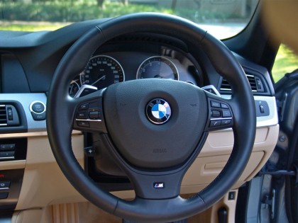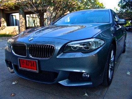 BMW 528i TwinPower Turbo ใส่ชุดแต่งของ M GmbH คือ รถทดสอบที่ผมรับมาจาก BMW Group Thailand มันมีสีเทา และมีเรือนร่างที่ใหญ่โตเกือบเท่า Series 7 แม้จะเคยขับ Series 5 F10 มาแล้วถึง 2 รุ่น (525i-520d) แต่ความประทับใจยังคงไม่เสื่อมคลาย นี่คือรถซาลูนระดับพรีเมียมที่มีการขับขี่ควบคุมอยู่ในอันดับต้นๆ ของวงการยนตรกรรม ภายในห้องโดยสารสีน้ำตาลอ่อนมีคอนโซลสีทูโทนที่ตัดกันอย่างลงตัว พวงมาลัยหุ้มหนังแท้สีดำอวบอ้วนของ M ทรงสามก้าน กาบบันได M ล้อ M เบาะตัวใหญ่ที่นั่งขับได้สบายก้น และปรับให้สูงหรือต่ำได้เท่าที่ต้องการ ตำแหน่งของการนั่งขับถูกปรับให้ต่ำลงไปอีก รวมถึงพวงมาลัยก็ยังถูกปรับให้หดกลับไปใกล้กับหน้าปัดมาตรวัดตามความถนัด ผมชอบปรับเบาะให้ลงต่ำสุดเนื่องจากท่านั่งที่ต่ำจะช่วยในเรื่องของจุดศูนย์ถ่วงหากต้องขับเข้าโค้งเร็วกว่าปกติ สัมผัสกับพวงมาลัยที่คุ้นเคยในสไตล์ M กริ้บที่อวบใหญ่ทำให้การหมุนและจับยึดมีความมั่นคงสูง แป้นเปลี่ยนตำแหน่งเกียร์สีเงินทั้งสองข้างยังแสดงให้เห็นถึงความพิเศษของ รุ่น รวมถึงโหมดการขับขี่ที่ผมเลือกใช้โหมด ECO PRO ซึ่งเป็นโหมดประหยัดเชื้อเพลิงสำหรับการวิ่งแบบไม่รีบเร่งและเหมาะสำหรับการใช้งานบนสภาพการจราจรของกรุงเทพฯ ที่ค่อนข้างจะสาหัสจากรถยนต์จำนวนมหาศาลที่แออัดกันอยู่บนท้องถนน ไม่นับรวมอีก 80,000 คันที่จะตามออกมาในเร็ววันนี้