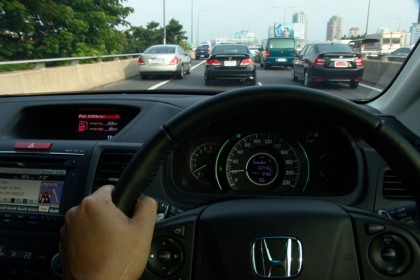 กดปุ่มสตาร์ต เครื่องยนต์ 2.4 ลิตร DOHC i-VTEC ติดขึ้นอย่างเงียบเชียบ ในรอบเดินเบามันเงียบจนคุณสงสัยว่าเครื่องยนต์ติดหรือยังหากไม่ได้สังเกตที่วัดรอบ คันเร่งไฟฟ้ามีน้ำหนักที่เบาสบายเท้า เหมาะกับการขับขี่ของคุณสุภาพสตรีที่นิยมความเบาสบาย ในโหมดเดินทางแบบประหยัดด้วยการกดไปที่สวิตช์ ECO สีเขียวขวามือของคนขับ คันเร่งในโหมดนี้จะถูกปรับให้สมดุลกับความประหยัด มันค่อนข้างยืดหยุ่นโดยที่รอบเครื่องยนต์จะค่อยๆ ไหลขึ้นไปเรื่อยๆ แรงบิดรอบต่ำของเครื่อง 2.4 ลิตร ทำให้ไม่เป็นปัญหาสำหรับการออกตัวแบบฉับพลันทันที รถจะพุ่งออกไปตามน้ำหนักที่กดลงบนแป้นคันเร่ง ที่รอบเครื่องยนต์ 1,800 รอบต่อนาที New CRV จะวิ่งด้วยความเร็วเกือบๆ 100 กิโลเมตรต่อชั่วโมง จอแสดงผลที่กึ่งกลางคอนโซลยังคอยแจ้งอัตราสิ้นเปลืองเชื้อเพลิงแบบกิโลเมตรต่อลิตร ซึ่งในรถทดสอบที่ผมขับขี่จะอยู่ในตัวเลข 9.3 กิโลเมตรต่อลิตร เป็นการขับที่ใช้คันเร่งค่อนข้างฟุ่มเฟือยโดยไม่สนใจที่จะขับแบบคลานเพื่อประหยัดเชื้อเพลิงแต่อย่างใดทั้งสิ้น ในความเป็นจริงก็คงจะไม่มีใครทำแบบนี้กันมากนักสำหรับการใช้ชีวิตประจำวันที่รีบเร่งในเมืองหลวง