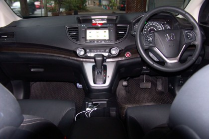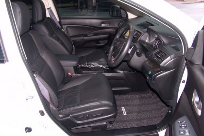 ท่านั่งที่สูงโด่งสไตล์ Crossover ทำให้มุมมองรอบคันในการควบคุม CRV อยู่ในระดับความสูงและทัศนวิสัยที่เหนือกว่ารถเก๋งขนาดกลางทั่วไป แถมยังช่วยเสริมความมั่นใจให้กับผู้หญิงที่มีรูปร่างเล็ก เนื่องจากมิติด้านความสูงและตำแหน่งของเบาะโดยสารถูกเพิ่มมากกว่ารถซีดาน เจ้า New CRV ยังมีการขยายขนาดของกระจกบานหน้า พื้นที่ของห้องโดยสารและมิติของตัวถังให้ใหญ่ขึ้นกว่าเดิมอีกนิดหน่อย วัสดุภายในพวกพลาสติกที่ใช้ตกแต่งมีรูปแบบที่ดี แต่เกรดของพลาสติกคอนโซลค่อนข้างแย่ ทำให้ขาดรสชาติของความสวยงามไปพอสมควร คอนโซลกลางมีขนาดใหญ่ตามมิติของตัวรถ ตำแหน่งของปุ่ม สวิตช์ จัดวางให้ใช้งานได้ง่าย โทนสีเทาเข้มของชิ้นงานช่วยลดแสงสะท้อนลงได้บ้าง เบาะคู่หน้าปรับตั้งด้วยไฟฟ้า สวิตช์สตาร์ต ปุ่ม ECO พวงมาลัยและแผงประตูรวมถึงผ้าบุหลังคากับพวงมาลัยสามก้านวงเล็กคล้ายกับของรถซิ่ง ทำให้ภายในห้องโดยสารมีความน่าใช้งาน มันช่วยกลบงานพลาสติกคุณภาพต่ำของคอนโซลได้อย่างกลมกลืน ผมชอบชิ้นงานคอนโซลแบบที่ใช้โฟมขึ้นรูปแล้วหุ้มด้วยหนังมากกว่าที่จะใช้พลาสติกทั้งแท่งมาทำเป็นแดซบอร์ดซึ่งแข็งกระด้างและซับเสียงได้ด้อยกว่า