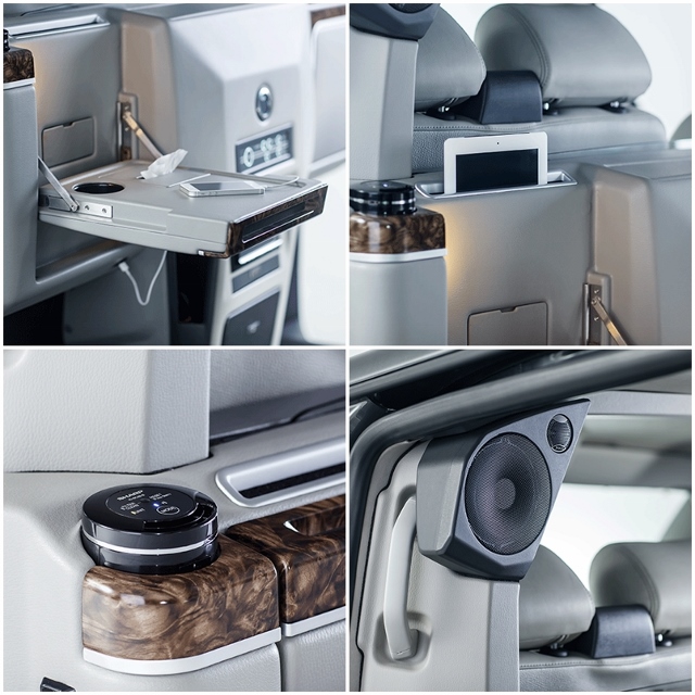 คอนโซลกลางขนาดบางลงและตกแต่งลายไม้โดยการผลิตขึ้นรูปด้วยพลาสติกแบบเดียวกับการผลิตคอนโซลรถยนต์น้ำหนักเบา แตกต่างจากการ Conversion โดยทั่วไป ที่ใช้ไม้เป็นขึ้นรูปมีน้ำหนักมาก ซึ่งส่งผลให้เกิดความชื้นและเชื้อราได้เมื่อเวลาผ่านไปหลายๆ ปี และหากเกิดอุบัติเหตุอาจก่อให้เกิดแรงกระแทกมากขึ้น นอกจากนี้ ได้ติดตั้งสิ่งอำนวยความสะดวกต่างๆ เช่น โต๊ะอเนกประสงค์, ช่องเก็บของ, ที่ใส่ Tablet เป็นต้น