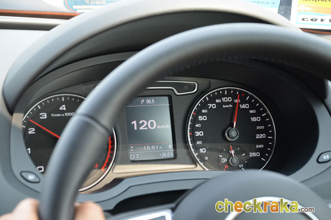เมื่อเริ่มออกตัวด้วยการกดคันเร่งที่มีน้ำหนักเบามากแต่มีความหนืดนิดๆ ควบคุมง่ายมาก ตัวรถพุ่งไปอย่างนุ่มนวล แทบไม่รู้สึกถึงอาการเปลี่ยนของระบบเกียร์ แต่ได้อัตราเร่งที่ต่อเนื่องมาก ในเวลาไม่นานกับน้ำหนักคันเร่งเบาๆ สามารถทำความเร็วขึ้นไปที่ 100 กม./ชม. ได้สบายๆ และหากเผลอเหยียบคันเร่งต่อเนื่องไปอีก ก็ไปถึงที่ความเร็ว 140 กม./ชม. แบบไม่รู้สึกตัว โดยความเร็วที่ 100 กม./ชม.นั้น ใช้รอบเครื่องยนต์เพียงเกือบๆ 2,000 รอบ/นาที และที่ความเร็ว 120 กม./ชม. ใช้รอบเครื่องยนต์ที่ 2,300-2,400 รอบ/นาที นับว่าไม่สูงเกินไป และในช่วงทางโล่งๆ ความเร็วไหลไปถึง 140 กม./ชม. ที่ 2,600 รอบ/นาที เท่านั้น อัตราเร่งแซงสำหรับ Audi Q3 มีให้ตามเท้าทุกครั้งอย่างไม่ต้องลังเลใจ เพราะเมื่อกดคันเร่งเพิ่มอีกเล็กน้อยเมื่อต้องการแซง เครื่องยนต์ก็สามารถตอบสนองได้ทันที โดยใช้รอบเครื่องยนต์ไม่สูง และไม่มีอาการรอรอบแม้แต่น้อย นับว่าขับสนุกมากๆ แม้ตัวรถจะมีขนาดค่อนข้างใหญ่กว่ารถซีดานหรือรถเก๋งบีเซกเมนต์ทั่วไป แต่ทำอัตราเร่งได้ดีเกินตัวจริงๆ