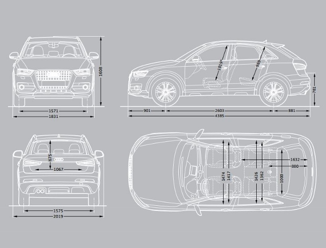 ออดี้ คิว3 มีขนาดตัวถังยาว 4,385 มม. กว้าง 1,831 มม. สูง 1,608 มม. จุดเด่นที่ชัดเจนสำหรับ Audi Q3 SUV คันนี้คือ ส่วนกระจังหน้าทรงหกเหลี่ยมเอกลักษณ์ของออดี้ทุกรุ่น พร้อมตราสี่ห่วง ไฟหน้าทรงสี่เหลี่ยมเรียวยาวขนานกับเส้นสายกันชนโคมแบบโปรเจคเตอร์ พร้อมไฟซีนอน และ Day time running light แบบ LED เป็นแบบเส้นเดียวรูปตัว "C" ไฟตัดหมอกทรงกลม ด้านข้างเน้นเส้นสายเหลี่ยมลากจากชุดไฟหน้ายาวจรดไฟท้าย ตกแต่งกรอบกระจกด้วยวัสดุโครเมี่ยม หลังคาติดตั้งแร็คมาให้ เป็นวัสดุสีดำ ส่วนประตูท้ายลาดเอียงรับกับแนวของกระจกหูช้างคู่หลัง ติดตั้งสปอยเลอร์ที่ด้านบน พร้อมที่ปัดน้ำฝนกระจกหลัง ไฟท้ายแบบ LED เป็นเส้นเดียวตลอดแนว กันชนหลังติดตั้งไฟตัดหมอกและไฟถอยหลัง ส่วนด้านล่วงตัดด้วยแผ่นสีดำ พร้อมปลายท่อไอเสียสแตนเลสแบบคู่