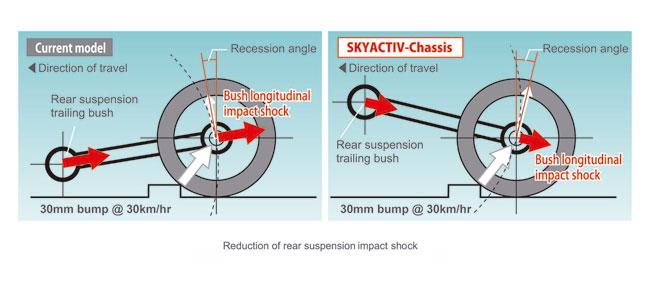 ช่วงล่างที่พัฒนาใหม่ Skyactiv-Chassis ออกแบบด้วยเทคโนโลยีสกายแอคทีฟปรับโครงสร้างรวมทั้งจุดยึดต่างๆ ให้รองรับภาระและน้ำหนักในขณะขับขี่ได้ทุกสภาวะ ด้านหน้าเป็นแม็คเฟอร์สันสตรัทพร้อมเหล็กกันโคลง ด้านหลังปรับโครงสร้างใหม่และจุดยึดสวิงอาร์ม ช่วยลดภาระช่วงล่างด้านหน้าในขณะเข้าโค้งและลดอาการท้ายลอยขณะเบรก ส่งผลให้ระบบเบรกที่ล้อหลังมีส่วนช่วยมากขึ้น ลดภาระของเบรกที่ล้อหน้าลง มาสด้าจึงออกแบบขนาดจานเบรกและคาร์ลิปเปอร์เบรกหน้าให้เล็กลง ทำให้ทุกชิ้นส่วนของช่วงล่างมีขนาดและน้ำหนักเบาตามมา ผลคือความประหยัดและสมรรถนะการทรงตัวที่ดีขึ้น พร้อมกับระบบพวงมาลัยแร็คแอนด์พิเนียนแบบไฟฟ้าเบาแรงแม่นยำ