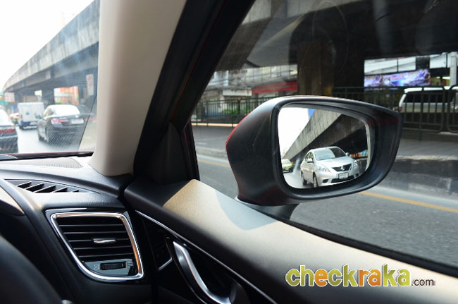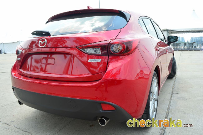 ส่วนของกระจกบานหลังเมื่อมองด้วยกระจกมองหลังดูเหมือนแคบและมองยาก แต่เมื่อขับใช้งานจริงกลับมองได้ปกติ กะระยะได้ไม่ยากนัก ติดตรงที่มุมมองเสา "C" (เสาด้านประตูหลัง) หนาไปบ้างจึงอาจบดบังรถได้เต็มคัน แต่มาสด้า 3 รุ่นนี้มีระบบเตือนจุดอับสายตามาด้วย จึงช่วยให้ปลอดภัยแม้มองไม่เห็นรถที่วิ่งอยู่ด้านข้าง