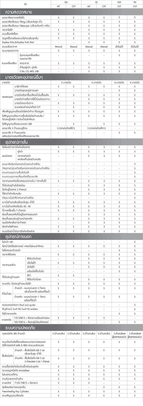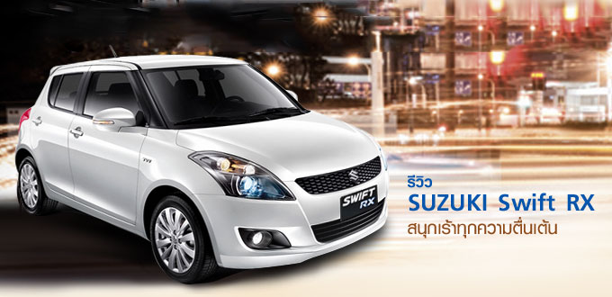 ซูซูกิ สวิฟต์ อาร์เอ็กซ์ - Suzuki Swift RX ปรับโฉมใหม่ ไฟโปรเจ็คเตอร์ไบ-ซีนอน ปรับระดับอัตโนมัติ ไฟท้ายลายใหม่ ติดตั้งสปอยเลอร์หลังขนาดใหญ่ทรงหนาขึ้น อุปกรณ์อำนวยความสะดวกเต็มคันทั้ง Cruise control, paddle shift ยกระดับเป็น "Premium Eco Car" เหนือกว่าคู่แข่ง เครื่องยนต์ 1.25 ลิตร และเกียร์ CVT 7 จังหวะ เร้าใจมากขึ้น ราคาโดนใจเพียง 599,000 บาท