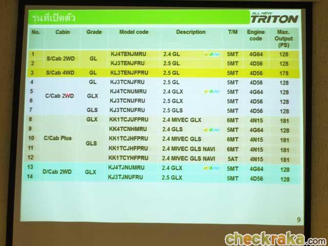 ข้อสังเกต เครื่องยนต์ MIVEC Clean Diesel 2.4 L จะติดตั้งในรุ่นยกสูงทั้งหมดทุกแบบตัวถัง ส่วนเครื่องยนต์ดีเซล 2.5 ลิตร DI-D คอมมอนแรลเทอร์โบ 128 แรงม้า และเบนซิน 2.4 ลิตร 128 แรงม้า จะติดตั้งในแบบรุ่นเตี้ยทั้งหมด และเครื่องยนต์ดีเซล 2.5 ลิตร DI-D VG TURBO คอมมอนแรล 178 แรงม้า อยู่ในรุ่นซิงเกิ้ลแค็บขับเคลื่อน 4 ล้อ