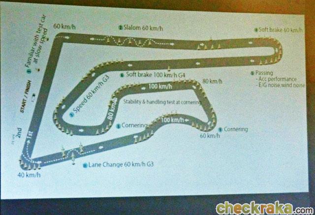 การทดสอบในสนามที่เน้นอัตราเร่ง ความเกาะถนน และระบบเกียร์ธรรมดาที่มี iMT มาช่วย เริ่มจากการขับในสนามช้างอินเตอร์เนชั่นแนล โดยมีผู้ฝึกสอนนั่งประกบข้างคนขับเพื่อให้คำแนะนำการขับอย่างถูกต้องและปลอดภัย ในรอบแรกจะเป็นการขับในโหมดธรรมดา ในลักษณะต่างๆ ตามจุดที่กำลังให้ดังนี้