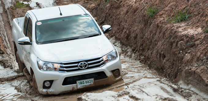 เริ่มต้นด้วยด่านโหดคือ การลุยทางขี้เลนพร้อมมีหลุมลึกหลังจากโดนฝนตกหนัก! จากการขับโดยคำแนะนำของผู้ฝึกสอน รีโว่ ผ่านไปได้อย่างไม่มีปัญหา ทั้งที่ใช้การปล่อยไหลของรอบเครื่องยนต์ในตำแหน่งเกียร์ "D" และใช้เพียงการแตะคันเร่งเบาๆ เพื่อขึ้นจากหล่มโคลนเท่านั้น ต่อมาเป็นการขับลงหลุมลึกที่กลายสภาพเป็น "บ่อโคลน" เพื่อพิสูจน์มุมด้านหน้า-หลังของรีโว่ที่สามารถผ่านไปโดยไม่มีติดตัวกันชนหน้าหรือหลังเลยแม้แต่นิดเดียว และผู้ฝึกสอนยังให้เร่งเครื่องขึ้นอย่างรวดเร็วโดยไม่สนว่าจะครูดกันชนอีกต่างหากครับ