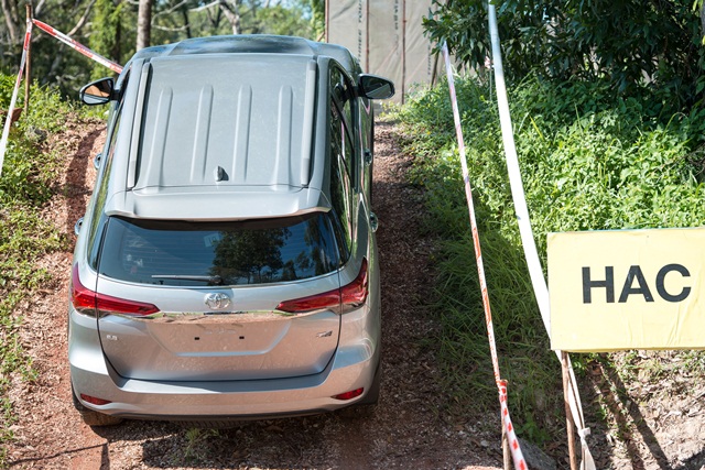 ผู้เขียนได้ลองขับพร้อมมีเจ้าหน้าที่ผู้ฝึกสอนนั่งไปด้วย เพื่อแนะนำการขับและใช้งานระบบต่างๆ ให้เหมาะสมกับการขับที่แตกต่างตามสถานี โดยก่อนเข้าพื้นที่ออฟโรดได้จอดปรับโหมดของระบบขับเคลื่อนซิกม่าโฟร์เป็น L4 ระบบขับเคลื่อน 4 ล้อ สำหรับเส้นทางวิบากและเส้นทางที่ต้องการกำลังขับเคลื่อนสูง พร้อมเปิดระบบ HAC โดยสถานีแรกเป็นเนินดินชัน ผู้เขียนทดลองหยุดรถระหว่างทางขึ้น เพื่อทดสอบระบบช่วยออกตัวบนทางลาดชัน HAC (Hill-Start Assist Control) พบว่าสามารถหยุดไม่ต้องแตะคันเร่งได้ประมาณ 3 วินาที เพียงพอต่อการค่อยๆ ให้น้ำหนักเดินคันเร่งผ่านเนินขึ้นไปอย่างง่ายดาย ส่วนขาลงก็ปล่อยให้ระบบควบคุมความเร็วขณะลงทางลาดชัน DAC (Downhill Assist Control) ทำงาน โดยผู้เขียนไม่ต้องแตะเบรกช่วยแต่อย่างใด