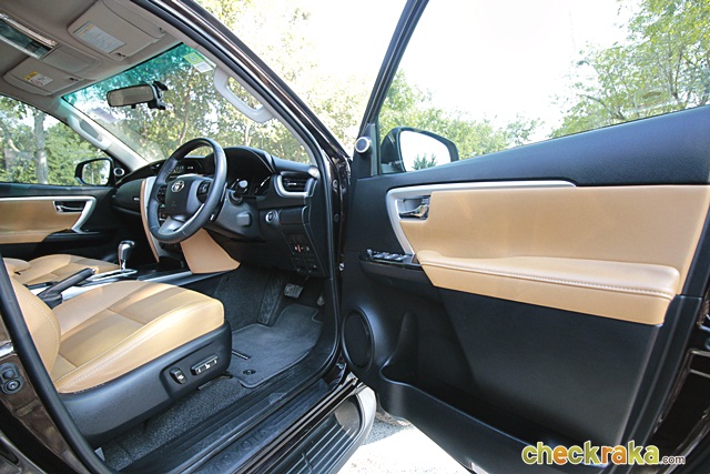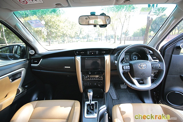 คอนโซลหน้า และคอนโซลกลางดูผ่านๆ คล้ายพื้นฐานจาก ไฮลักซ์ รีโว่ แต่อันที่จริงมีความแตกต่างค่อนข้างมาก เช่น ตรงช่วงที่อยู่ของชุดเครื่องเสียงและระบบแอร์ เป็นต้น พร้อมกับตกแต่งให้หรูหราขึ้นด้วยการเลือกใช้วัสดุระดับคุณภาพสูงกว่า ให้อารมณ์ Luxury เทียบเคียงแบรนด์หรูร่วมค่ายอย่าง Lexus แผงกันแดดด้านบนมาตรวัดใช้วัสดุนุ่มมือ หุ้มด้วยหนังแท้ ตรงส่วนกลางเหนือช่องแอร์เป็นพลาสติกฉีดขึ้นรูป ที่ฝาที่เก็บของด้านบนใช้วัสดุนุ่มหุ้มหนังเช่นกัน ทำให้ความรู้สึกแตกต่างจากคอนโซลของรีโว่โดยสิ้นเชิง