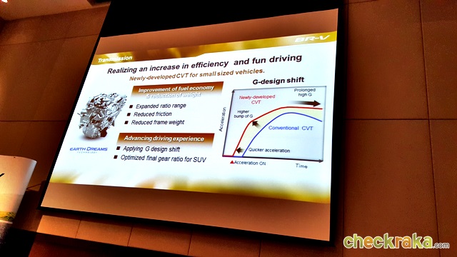 สำหรับช่วงขึ้นเขาหรือเนินชันมากๆ อาจต้องใช้รอบเครื่องยนต์สูงอยู่บ้างจากการคิกดาวน์ แต่ความเร็วก็จะเพิ่มขึ้น เมื่อค่อยถอนเท้าออกจากคันเร่งเล็กน้อย รอบเครื่องยนต์ก็จะลดลง เกียร์ CVT จะแปรผันให้อัตราทดต่ำลง ยิ่งเพิ่มความเร็วได้อีก และเมื่อได้ความเร็วที่เหมาะสมรอบก็จะต่ำลงมาปกติ