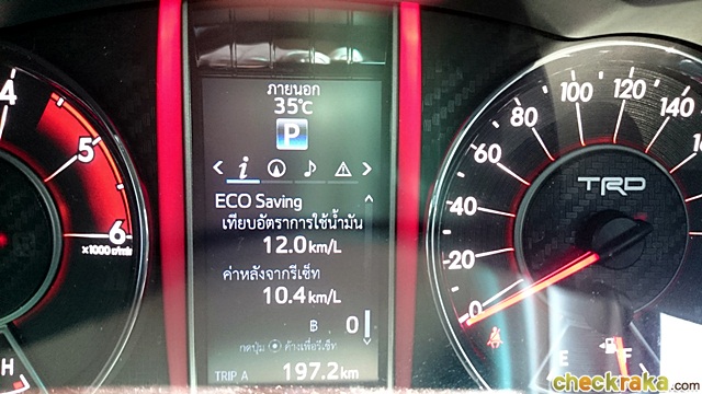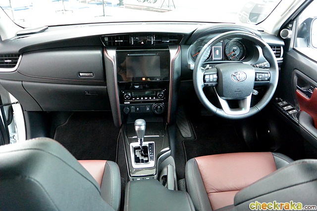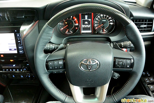 ฟอร์จูนเนอร์ TRD ภายในห้องโดยสารขยับปรับเปลี่ยนให้สอดรับความสปอร์ตมากขึ้น นับตั้งแต่ก้าวขึ้นไปนั่งรู้สึกว่าหรูและสปอร์ตขึ้น ด้วยวัสดุหนังผสมหนังสังเคราะห์สีดำ-แดงแบบทูโทน และเดินด้ายสีแดงแนวสปอร์ต พร้อมเสริมหลายจุดด้วยการหุ้มฟิลม์ลายคาร์บอนเคฟลาร์ ส่วนวัสดุโครเมียมภายในรถเป็นแบบเงารมดำ แต่ส่วนที่เด่นและผู้เขียนชอบคือ มาตรวัดเรืองแสงแบบ Optitron ออกแบบใหม่ พื้นหลังวงกลมกลางลายคาร์บอนฯ ด้านขวามาตรวัดความเร็วมีสัญลักษณ์ TRD สีขาว ตัดบนพื้นคาร์บอนฯ สวย ได้อารมณ์เรซซิ่ง นอกจากนี้ก็มีพรมเฉพาะรุ่น ซึ่งน่ามีขายแยกในโชว์รูม และปุ่ม Push Start สีแดงสัญลักษณ์ TRD