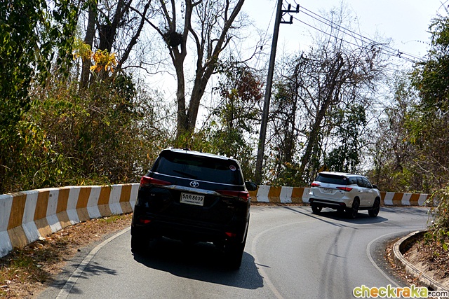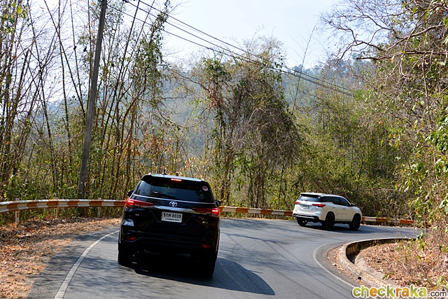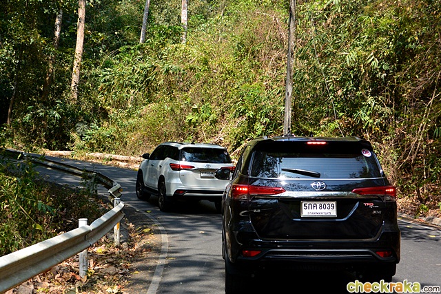 ขบวนฯ ขึ้นมาถึงที่ว่าการอุทยานฯ ด้านบนในช่วงเวลาไม่นาน และขับไปลงที่ด่านปราจีนฯ เพื่อแวะพักที่ดาษดา รีสอร์ท ในช่วงเส้นทางขึ้น-ลงเขาใหญ่ที่ขับผ่านมา ผู้เขียนรู้สึกว่าตัวรถมั่นคงกว่ารุ่นปกติในช่วงเข้าโค้งอย่างชัดเจน การบังคับเลี้ยวเฉียบคมขึ้น และกระฉับกระเฉงดี แม้ใช้ล้ออัลลอยใหญ่ถึง 20 นิ้ว และยางหน้ากว้าง 265/50 ผสานกับช่วงล่างแบบสปอร์ต จึงทำให้ ฟอร์จูนเนอร์ TRD ขับสนุก และมั่นใจในการทำความเร็วหรือเข้าโค้งมากขึ้น รวมไปถึงระบบเบรกที่เป็นดิสก์หลังขนาดใหญ่ติดตั้งแทนแบบดรัมในรุ่นปกติ จริงๆ เป็นการปรับให้เหมาะสมกับคาแรคเตอร์รุ่น TRD Sportivo ที่เน้นความสปอร์ตมากกว่า ถ้าใช้งานทั่วไปดรัมเบรกหลังก็ให้พลังหยุดเพียงพออยู่แล้ว สำหรับความรู้สึกที่ได้จากการเบรกของรถรุ่นนี้ พบว่าระบบเบรกให้น้ำหนักดี ให้ความมั่นใจแม้เบรกต่อเนื่องในช่วงทางลงเขา