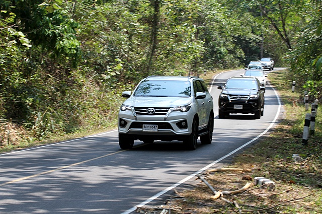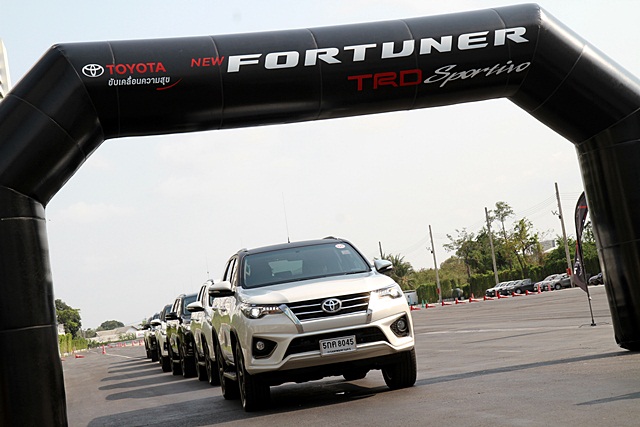 การขับทดสอบ ฟอร์จูนเนอร์ TRD เริ่มต้นด้วยการนั่งรถตู้ไปที่ เทมส์ วัลลีย์ รีสอร์ท เขาใหญ่ เพราะผู้เขียนอยู่ในกลุ่มขับเที่ยวกลับ โดยมีนักข่าวอีกกลุ่มขับเที่ยวไปในวันเดียวกัน ในวันรุ่งขึ้น ขบวนรถทดสอบ ฟอร์จูนเนอร์ TRD เริ่มทยอยออกจากที่พักในช่วงสาย โดยรถ 1 คัน ต่อนักข่าว 2 คน ให้สลับขับกันเองระหว่างทาง ขบวนฯ มุ่งหน้าขึ้นอุทยานฯ เขาใหญ่ ผ่านด่านเก็บค่าเข้าแล้วขับขึ้นไปยังที่ว่าการฯ ด้านบน ผ่านเส้นทางคดเคี้ยวที่หลายคนคุ้นเคย ช่วงขาขึ้นต้องใช้พลังในการขึ้นเขาผ่านโค้งพับซ้าย-ขวาหลายช่วง กำลังของเครื่องยนต์ 177 แรงม้า แรงบิด 450 นิวตัน-เมตร ผสานกับเกียร์อัตโนมัติ 6 จังหวะ สามารถพาตัวรถขับเคลื่อนผ่านความชัน และเร่งแซงรถช้าด้านหน้าได้อย่างสบายๆ ที่แม้แต่ผู้ขับรถขึ้นเขาไม่เก่งก็ไม่ต้องกลัว เพราะตัวรถเพียบพร้อมด้วยเทคโนโลยีและระบบช่วยต่างๆ มากมาย ที่สำคัญพลังเหลือเฟือ และเกียร์ดีพอช่วยให้ผู้ขับไม่ต้องกังวลกับการจังหวะการเร่ง-หยุดบนทางชัน