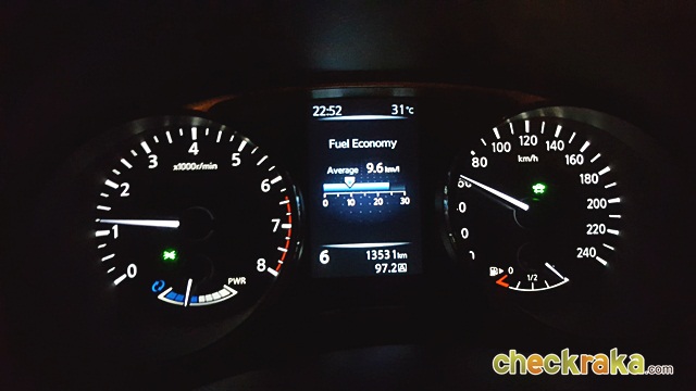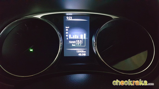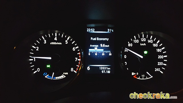 ส่วนมาตรวัดอัตราสิ้นเปลืองเฉลี่ยบนหน้าปัดวัดได้ 13.3 กม./ลิตร และค่าดีที่สุดที่บันทึกไว้ 17.1 กม./ลิตร โดยการวัดครั้งนี้ขับแบบปกติมีการเร่งแซง การออกตัวอย่างรวดเร็วในบางครั้ง และโหมด EV ที่สลับใช้บ้าง ไม่ใช่การตั้งใจขับช้าๆ เลี้ยงคันเร่ง เพื่อเลียนแบบการใช้งานจริงมากที่สุดครับ
