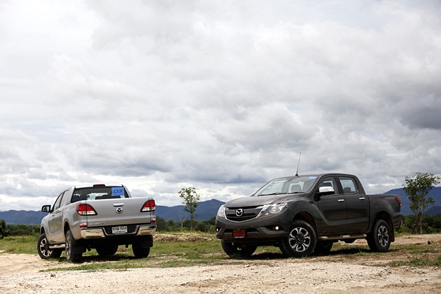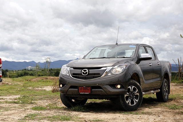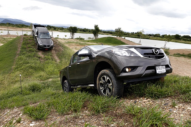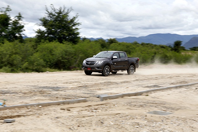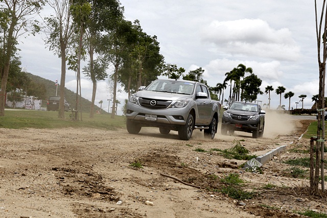 การทดลองขับ BT-50 PRO ใหม่ ขับจากอาคารอินเตอร์เชนจ์ 21 กรุงเทพฯ มุ่งหน้าสู่สนามทดสอบออฟโรด กรังด์ปรีซ์ กอล์ฟคลับ กาญจนบุรี ขับบนทางหลวงเป็นระยะทางกว่า 180 กม. โดยรถที่ใช้เป็นรุ่นดับเบิ้ลแค็บ DBL Hi-Racer ( 773,000 บาท) เครื่องยนต์ดีเซล 2.2 ลิตร ขับเคลื่อน 2 ล้อ เพื่อเน้นขับทางเรียบ มีผู้โดยสาร 3 คนรวมคนขับ เส้นทางหลังจากพ้นตัวเมือง สามารถทำความเร็วได้มากขึ้น แต่ก็เริ่มรู้สึกอาการแข็งกระด้าง และโยนตัว โดยเฉพาะตำแหน่งเบาะหลัง ช่วงขึ้นสะพานอาการโยนและกระเด้งชัดเจนมาก จึงแวะปั๊มเพื่อทำการเช็คแรงดันลมยางใหม่ ให้อยู่ในระดับพอดีราว 34 ปอนด์ ทุกล้อ ผลปรากฎว่าอาการแข็งกระด้างลดลงชัดเจน และสามารถนั่งได้อย่างสบายขึ้น และเพลินไปกับระบบอำนวยความสะดวกต่างๆ ภายในรถ โดยเฉพาะชุดเครื่องเสียงที่สามารถเชื่อมต่อผ่านบลูทูธกับสมาร์ทโฟนได้ อัตราเร่งและการบังคับเลี้ยวยังคงเป็นจุดที่น่าประทับใจเหมือนเดิมจากเครื่องยนต์บล็อคเดิม แต่ที่เพิ่มเติมคือ อุปกรณ์ภายในมีมากขึ้น ดีไซน์ภายนอกและภายในดูดีขึ้น