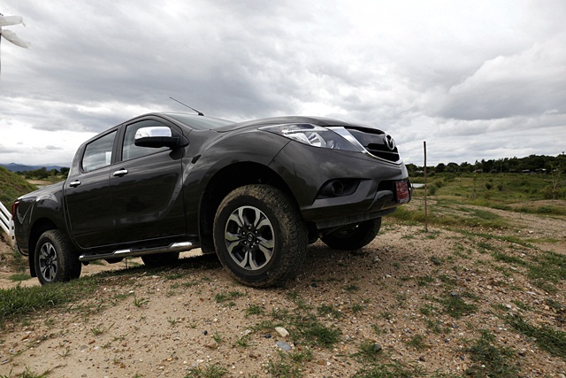 เมื่อถึงสนามออฟโรดก็ได้เปลี่ยนมานั่งรุ่นขับเคลื่อน 4 ล้อ และลองขับลุยตามสถานีต่างๆ ภายในสนาม พบว่าระบบช่วงล่างด้านหน้าที่เป็นแบบอิสระปีกนกคู่ (Double-wishbone) และคอยล์สปริง ด้านหลังแบบคานแข็งและชุดแหนบ (Leaf-Spring) คงความสบายในการขับแม้ลุยทางออฟโรด การควบคุมรถ ด้วยระบบบังคับเลี้ยวแรคแอนพีเนียน (Rack-and-pinion Steering) สามารถตอบสนองได้ดี อัตราทดพวงมาลัยเร็วขึ้น และองศาการเลี้ยวก็เพิ่มมากขึ้นด้วย ช่วยให้เลี้ยวได้คล่องแคล่ว และแม่นยำ นอกจากนี้ ยังทราบมาว่า BT-50 PRO ใหม่ สามารถลุยน้ำได้สูงถึงระดับ 80 เซนติเมตร ในรุ่นขับเคลื่อน 2 ล้อแบบยกสูง Hi-Racer และรุ่นขับเคลื่อน 4 ล้อ และระดับ 60 เซนติเมตร ในรุ่นขับเคลื่อน 2 ล้อ โดยที่เครื่องยนต์และระบบส่งกำลังของรถยังทำงานได้ตามปกติ เพราะตำแหน่งของไดชาร์จอยู่สูงกว่ารถปิกอัพทั่วไป