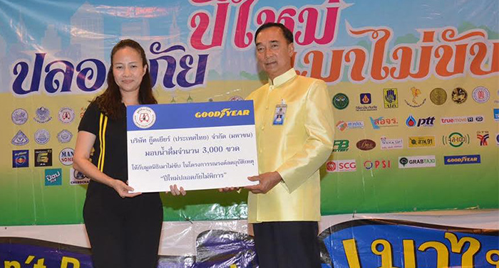 บริษัท กู๊ดเยียร์ ประเทศไทย จำกัด (มหาชน) ร่วมกับกระทรวงคมนาคม และมูลนิธิเมาไม่ขับ สานต่อการปลุกจิตสำนึกเรื่องการขับขี่อย่างปลอดภัย ในโครงการ "ปีใหม่ปลอดภัยไม่พิการ" เพื่อลดอุบัติเหตุบนท้องถนนในช่วงเทศกาลปีใหม่ มอบน้ำดื่ม 3,000 ขวดให้กับมูลนิธิเมาไม่ขับ เพื่อนำไปแจกจ่ายให้กับผู้ขับขี่ โดยสนับสนุนให้มีการขับขี่อย่างปลอดภัยระหว่างการเดินทาง ซึ่งเป็นการสานต่อโครงการรูปแบบเดียวกันที่จัดขึ้นในช่วงเทศกาลสงกรานต์ ด้วยการบริจาคอุปกรณ์ตรวจสอบสภาพรถให้กับคณะวิศวกรรมศาสตร์และเทคโนโลยี มหาวิทยาลัยเทคโนโลยีพระจอมเกล้าพระนครเหนือ วิทยาเขตระยอง
