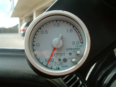 มาถึงของแต่งขั้น Advance กันหน่อยนั่นคือ เกจ์วัดแรงดันอากาศหรือวัดบูสต์ ซึ่งเหล่าขาซิ่งรถเปลี่ยนเครื่องยนต์เทอร์โบจะขาดไม่ได้ แม้ไม่ได้ปรับแต่งเครื่องยนต์เทอร์โบใดๆ เลย ก็ต้องมีประดับคอนโซลหน้าเอาไว้อุ่นใจกว่า นับว่าวัดบูสต์ก็ให้ประโยชน์ในการดูแรงดันอากาศจากการปั่นของเทอร์โบเข้าเครื่องยนต์ว่า แรงดันตก และสม่ำเสมอหรือไม่ ส่วนพวงที่ปรับแต่งโมดิฟายมากขึ้นก็ใช้ดูอัตราการบูสต์ เพื่อระวังสูบทะลุก่อนจะปรับแรงดันเทอร์โบมากเกินไปได้อีกด้วย